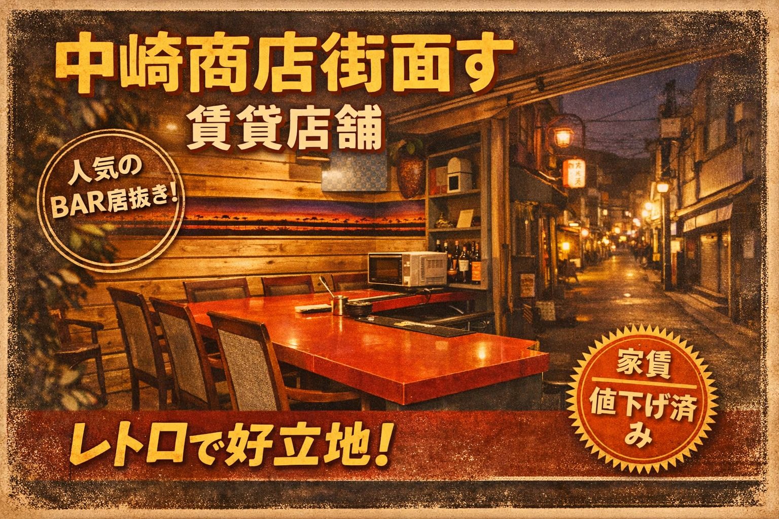 中崎商店街に面した好立地のバー居抜き店舗です。